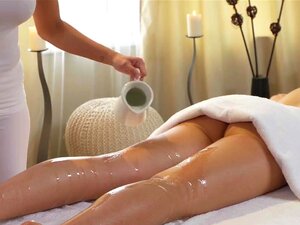 Despertar deseos cachondos de bellezas. Frotar aceite por todo el cuerpo de la chica la pone muy cachonda