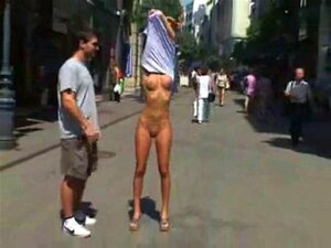 Chica totalmente desnuda en una calle pública. Chica completamente desnuda en una calle pública