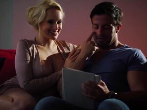 La flaca rubia Kenna James con grandes tetas falsas escucha gemidos provenientes del dormitorio. Entra y encuentra a la niñera tetona April Olsen con la gran polla de su marido. El marido ordena a la rubia sorprendida que se una y después de una mamada la