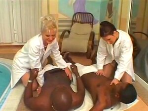 Masajistas europeas tienen sus coños empapados estirados por una polla negra ebo