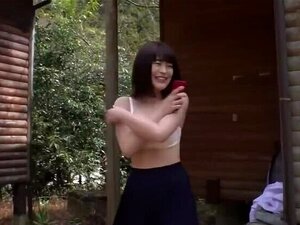 Estudiante japonesa juega con sus tetas mientras mea en la naturaleza. Estudiante japonesa encuentra tiempo para relajarse y jugar con sus grandes tetas mientras se mea las bragas