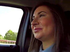 Una linda japonesa monta polla. Una linda japonesa en uniforme monta polla en coche en público