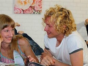 Gran polla para la pequeña rubia. La sexy Ashley lame las bolas después de que un chico le toque el ano apretado. ¡La pequeña rubia monta una polla gorda en postura de vaquera inversa y disfruta de una penetración intensa en postura de cuchara hasta que s